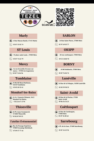 Welcome to Tezel Metz Sablon Apero Snack Restaurant Oriental Food, an exquisite culinary haven located at 24 Rue Saint-Pierre, Metz, France. This vibrant eatery specializes in a delightful menu that showcases the rich flavors of oriental cuisine.